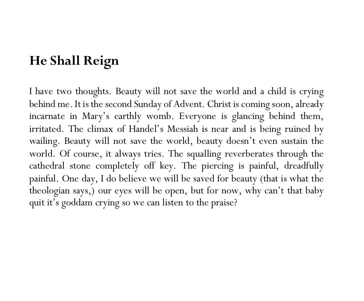 I have two thoughts. Beauty will not save the world and a child is crying behind me. It is the second Sunday of Advent. Christ is coming soon, already incarnate in Mary’s earthly womb. Everyone is glancing behind them, irritated. The climax of Handel’s Messiah is near and is being ruined by wailing. Beauty will not save the world, beauty doesn’t even sustain the world. Of course, it always tries. The squalling reverberates through the cathedral stone completely off key. The piercing is painful, dreadfully painful. One day, I do believe we will be saved for beauty (that is what the theologian says,) our eyes will be open, but for now, why can’t that baby quit it’s goddam crying so we can listen to the praise?